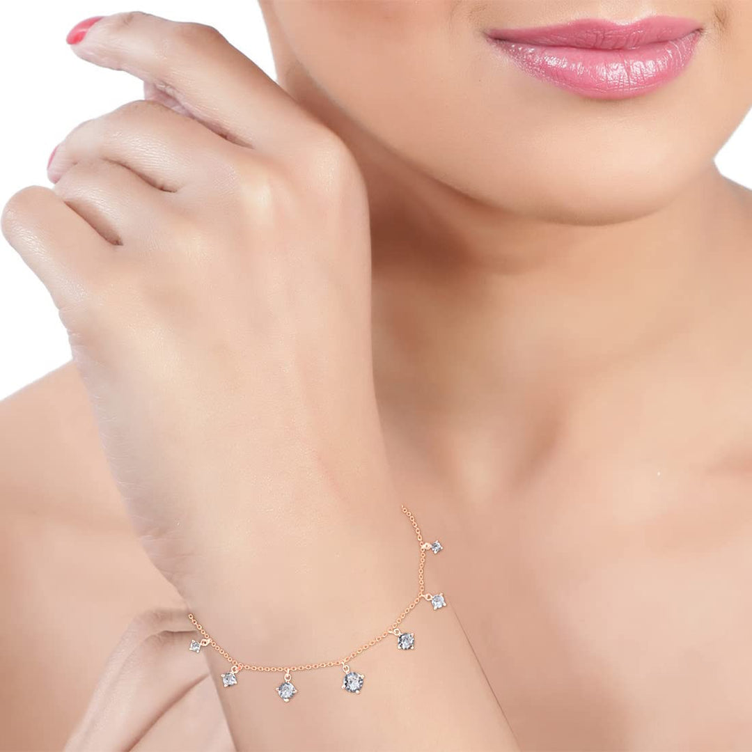 Silver Line Bracelet is a classic and radiant cubic zirconia bracelet. It is handcrafted in Pure silver and designed with a unique toggle lock, making it even more stylish than ever. 925 Sterling Silver round shape white CZ rose gold bracelet for women. Thin Rolo chain rhodium finishes with a spring ring clasp. Silver Line Bracelet is a classic and radiant cubic zirconia tennis bracelet. It is handcrafted in Pure silver and designed with a unique toggle lock, making it even more stylish than ever. This lightweight and rhodium finish bracelet will add a compliment to your casual or formal attire. The elegant gift box is ready to treat yourself or a loved one for any anniversary, birthday, wedding, graduation, Christmas, Mother?é¼?äós Day, Valentine?é¼?äós Day, and any other holiday or special occasion gifting. Our jewellery is nickel-free, lead-free, and non-allergic to all skin types. Keep it away from perfume, sprays, and water. Preserve your Jewellery in the original box or a soft cloth pouch when not in use.