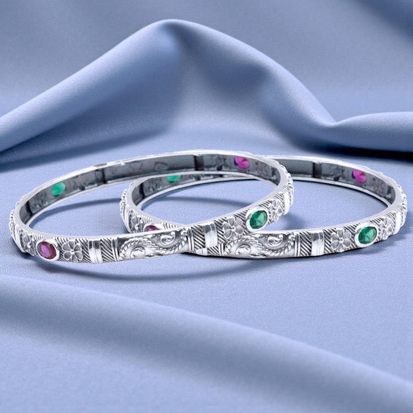 - PRODUCT FEATURES: Beautifully designed with intricate engraved floral motifs, textured detailing, and multi-color gem accents for a vibrant touch. The bangle features a rhodium finish for added brilliance, comes in size 2.6 (6 cm inner diameter), and weighs approximately 28.5 grams. Its rigid, slip-on style makes it stylish and easy to wear.